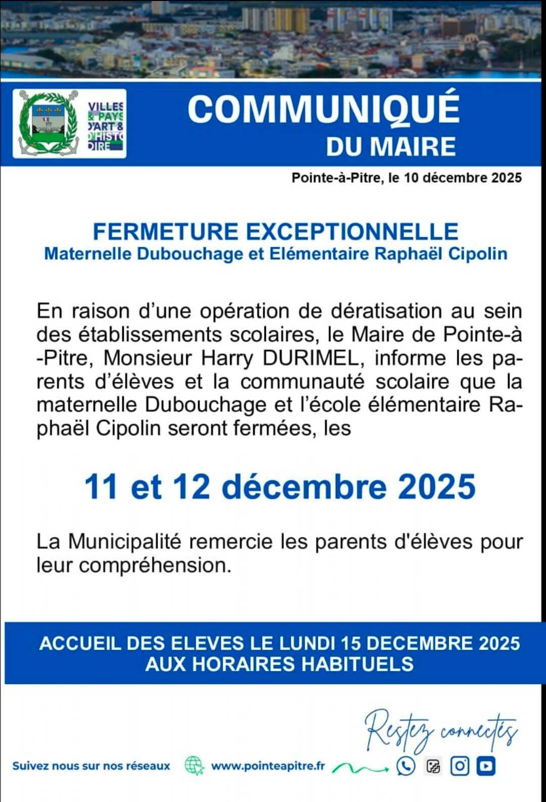 Fermeture exceptionnelle maternelle Dubouchage et élémentaire Raphaël Cipolin