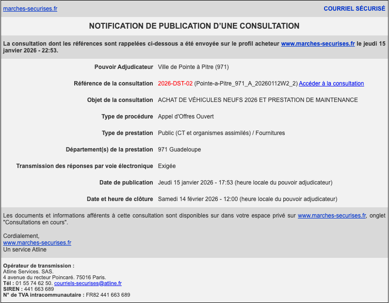 Appel d'offres: "Achat de véhicules neufs 2026 et prestation de maintenance"